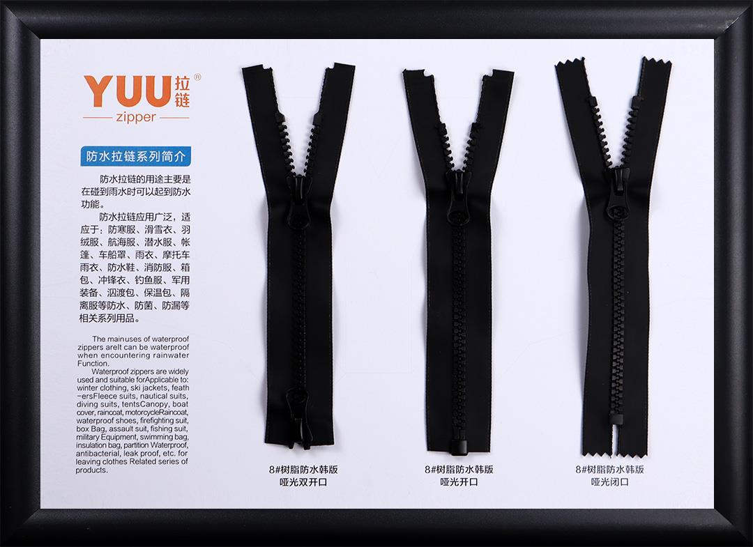 Waterproof zippers are widely used and suitable forApplicable to: winter clothing, ski jackets, feathersFleece suits, nautical suits, diving suits, tentsCanopy, boat cover, raincoat, motorcycleRaincoat, waterproof shoes,firefighting suit, box Bag, assault suit, fishing suit, military Equipment, swimming bag, insulation bag, partition Waterproof, antibacterial, leak proof,etc. for leaving clothes Related series of products.